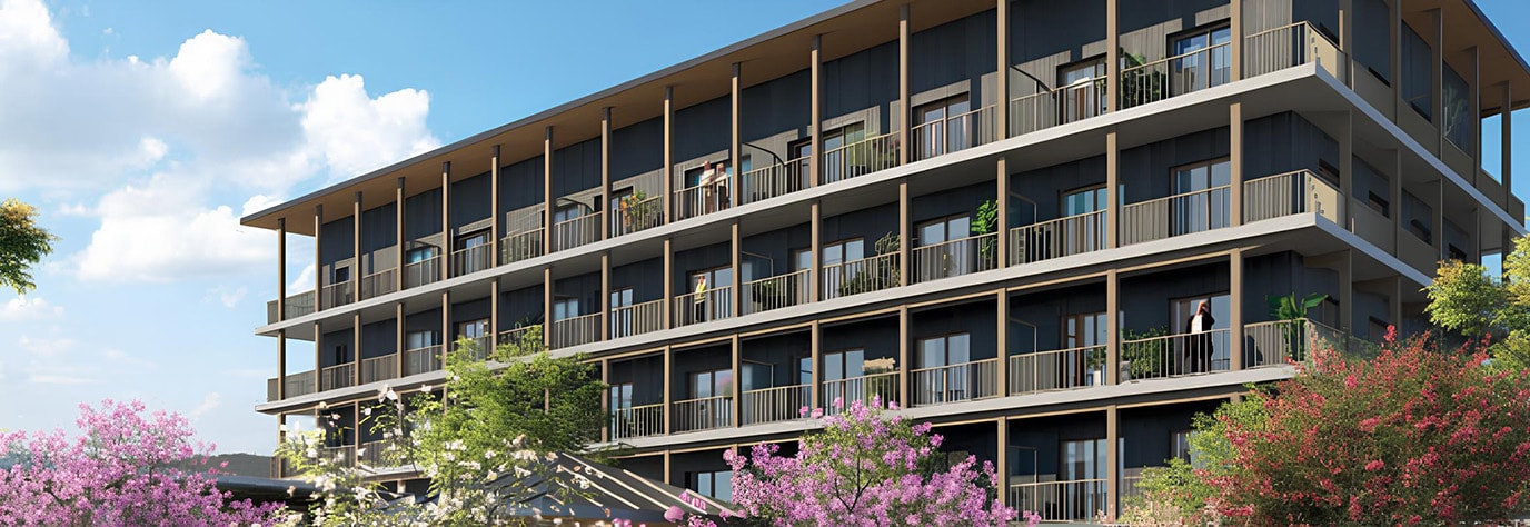Chaque appartement, du T1 au T3, bénéficie de grandes ouvertures et de balcons ou terrasses généreuses, créant une sensation de cocon lumineux et chaleureux. Les logements en rez-de-chaussée profitent, quant à eux, d'un espace extérieur privatif (terrasse et jardin), offrant une intimité rare dans ce type de programme.